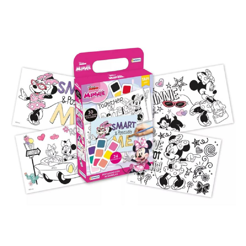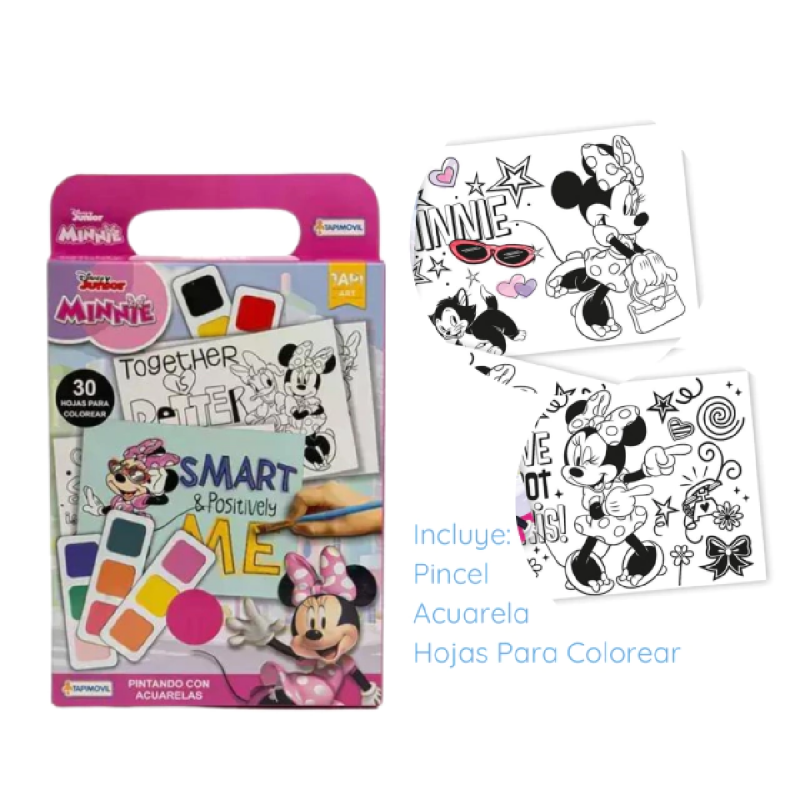 Incluye: 30 hojas para colorear con los personajes de Minnie , 24 colores de acuarelas y 1 pincel