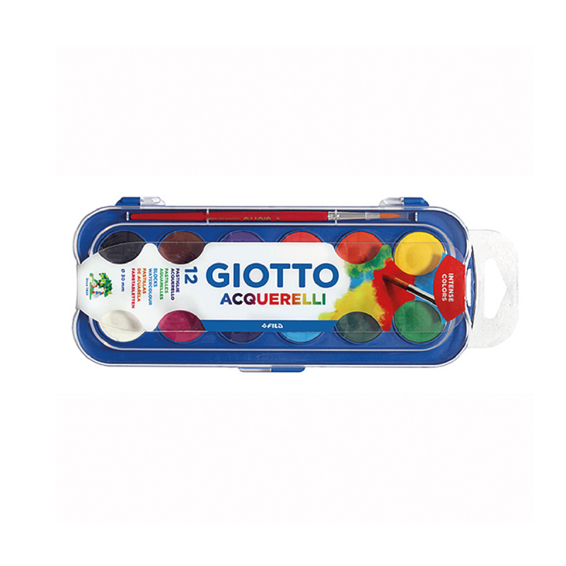 Acuarelas Giotto en pastillas de 30mm de diámetro, de colores intensos y fáciles de diluir. Con pincel de calidad en cerda sintética.