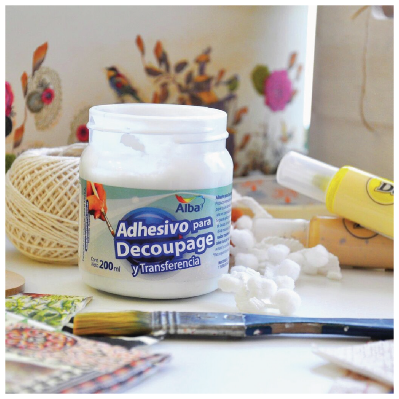 Es un producto especialmente formulado para adherir servilletas de papel tissue o fotocopias a distintas superficies: madera, cartón, fibrofácil, tela, vidrio, goma eva, etc.