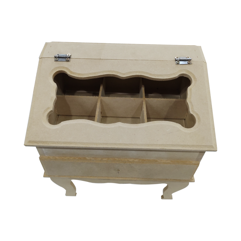 Caja de te con bisagra, tapa calada con vidrio incluido, patas y cajón frontal.