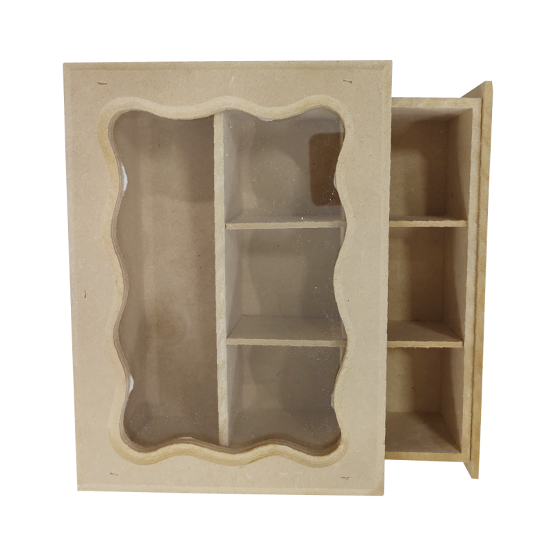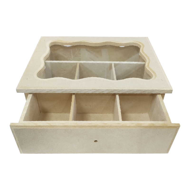 Caja de te con cajón y vidrio de 6 divisiones.