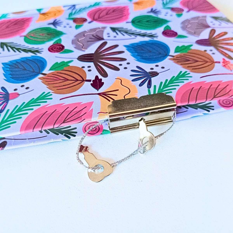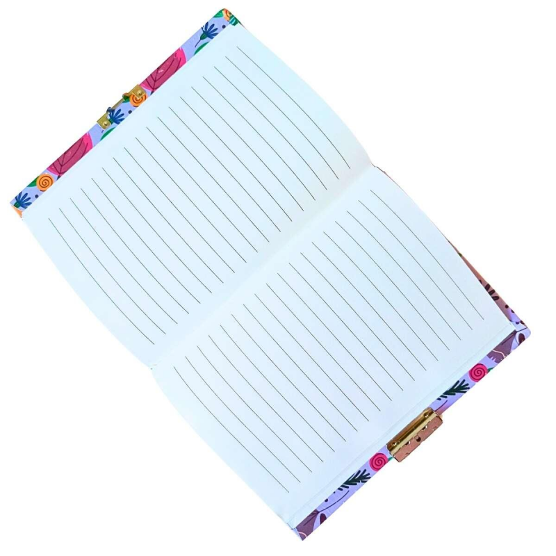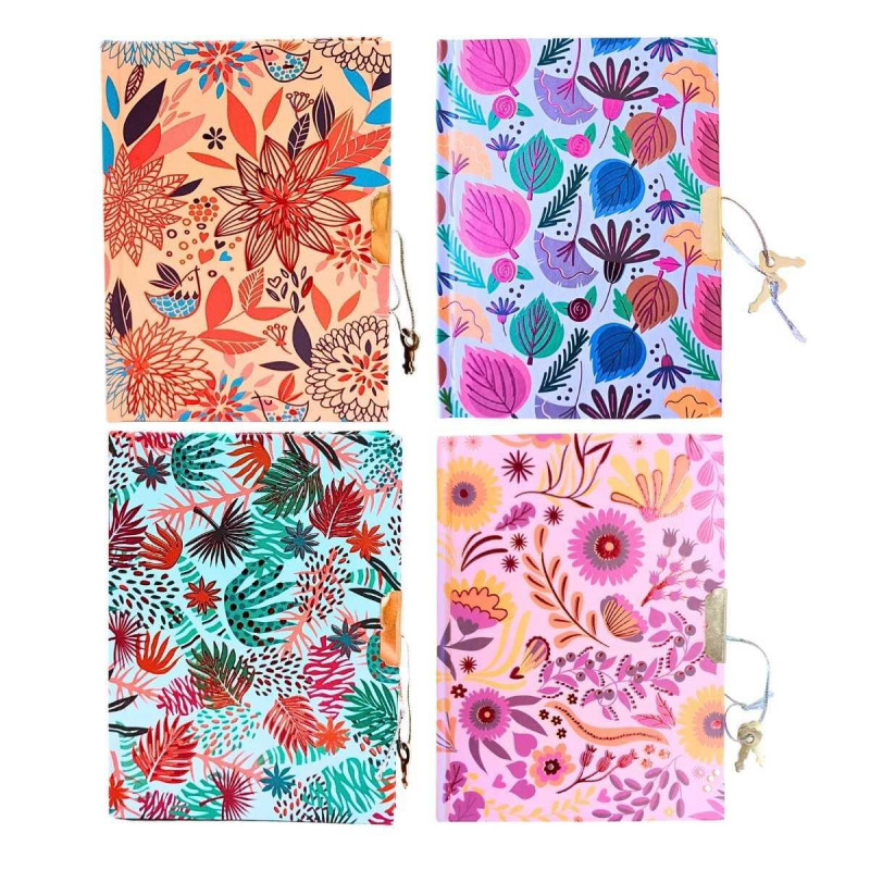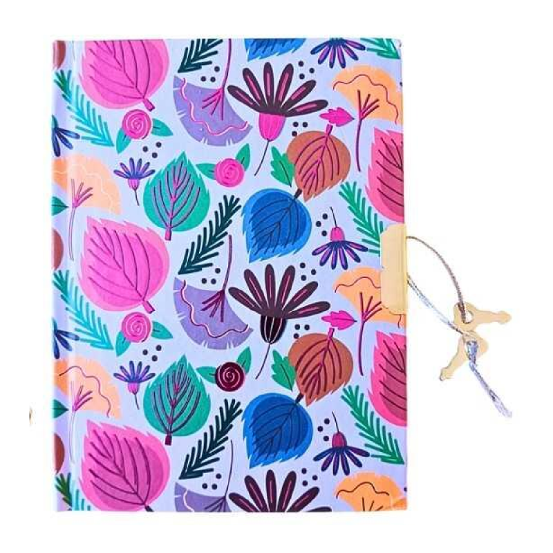Diario íntimo pequeño de tapa dura con diseños de flores y hojas en colores vivos y detalles metalizados. Contiene hojas rayadas y cierre con llave.