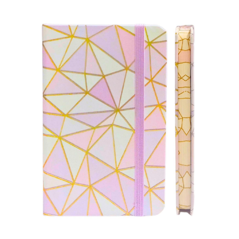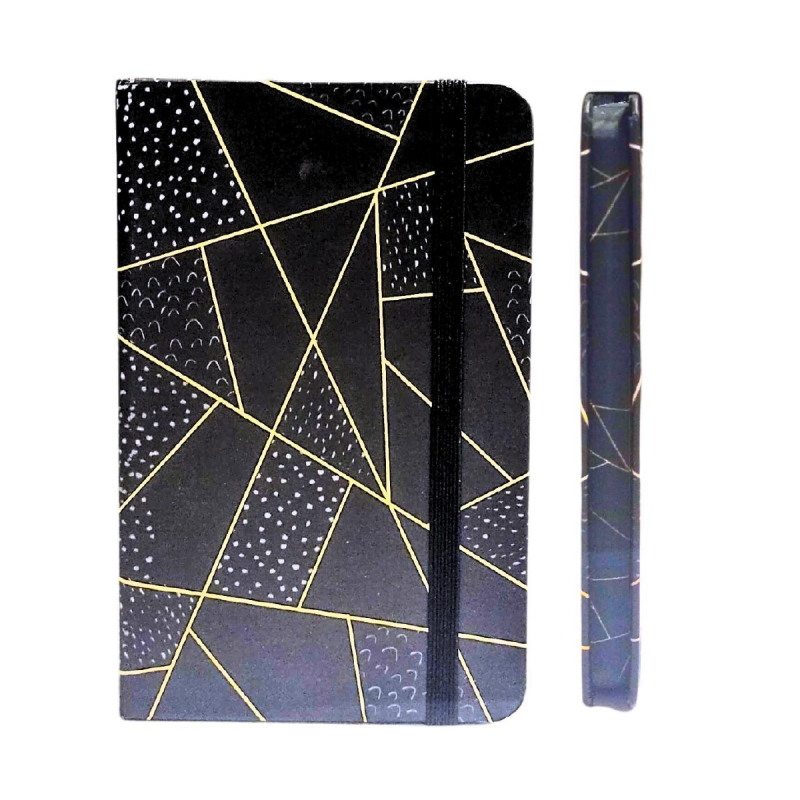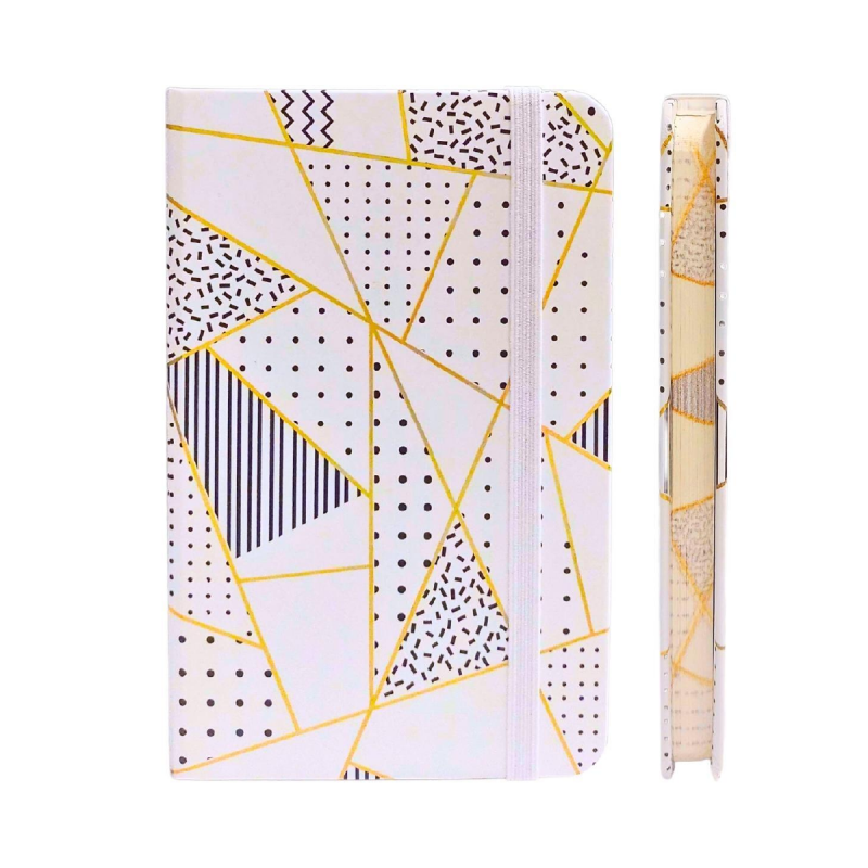 Pequeña libreta tamaño A6, de tapa dura con diseños de figuras geométricas delineadas en dorado metalizado. Contiene 80 hojas lisas y banda elástica de cierre.