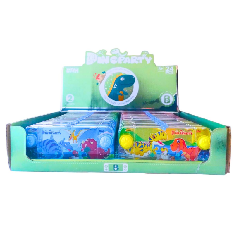 Diseño infantil con ilustraciones de dinosaurios en un paisaje colorido.