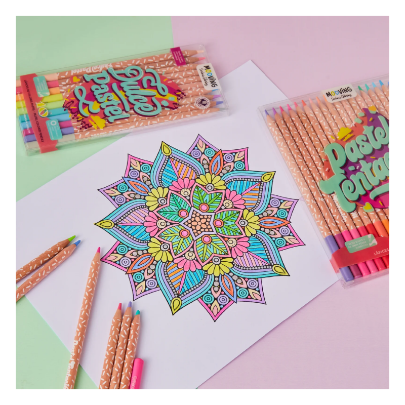 Lápices de colores pasteles Mooving de cuerpo circular, elaborados con suave madera colorada de tilo de la máxima calidad y resistencia, formula especial que garantiza el fácil sacado de punta de colores pastel bien logrados e intensos con gran poder cubritivo. Sus minas de 3.3 mm. de alta resistencia son suaves y blandas, brindando la mejor sensación en su trazado.