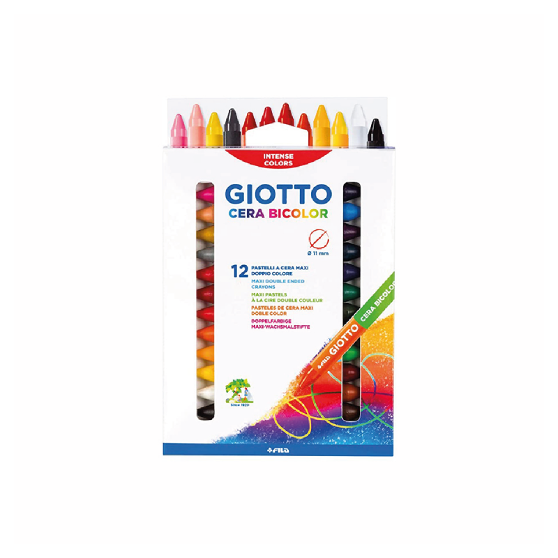 Cera Bicolor: un crayón extra grueso, de 11.5mm de diámetro, con doble punta, una de cada color. En total contiene 24 intensos colores!