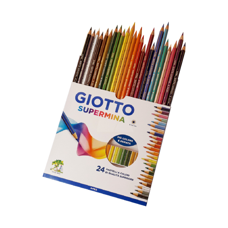 Supermina es el lápiz Premium de la línea Giotto, únicos fabricados con madera de cedro incienso. La diferencia está en la mina de 3.8mm. Super resistente, con calidad superior, rica en pigmentos, con gran capacidad cubritiva y colores más brillantes.