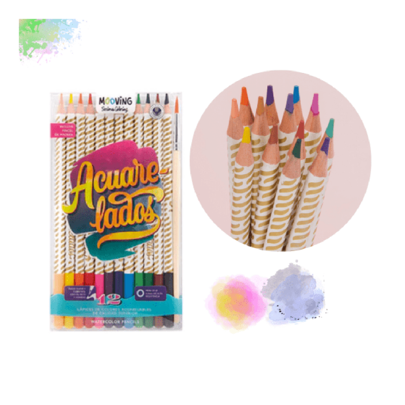 12 lápices de colores acuarelables de cuerpo circular con diseño exclusivo Mooving.