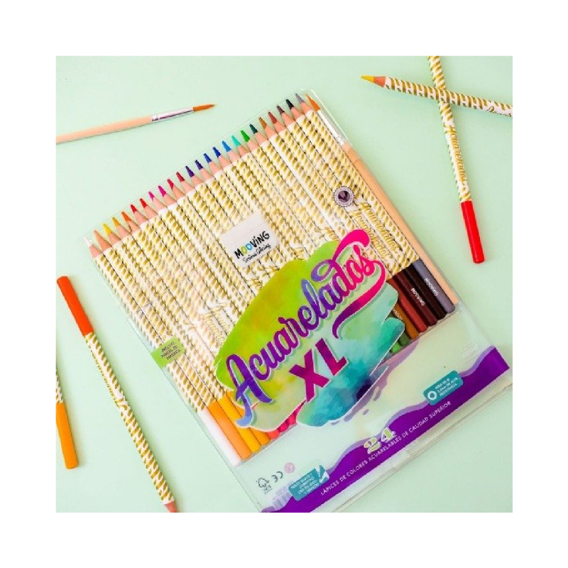 24 lápices de colores acuarelables de cuerpo circular con diseño exclusivo Mooving.