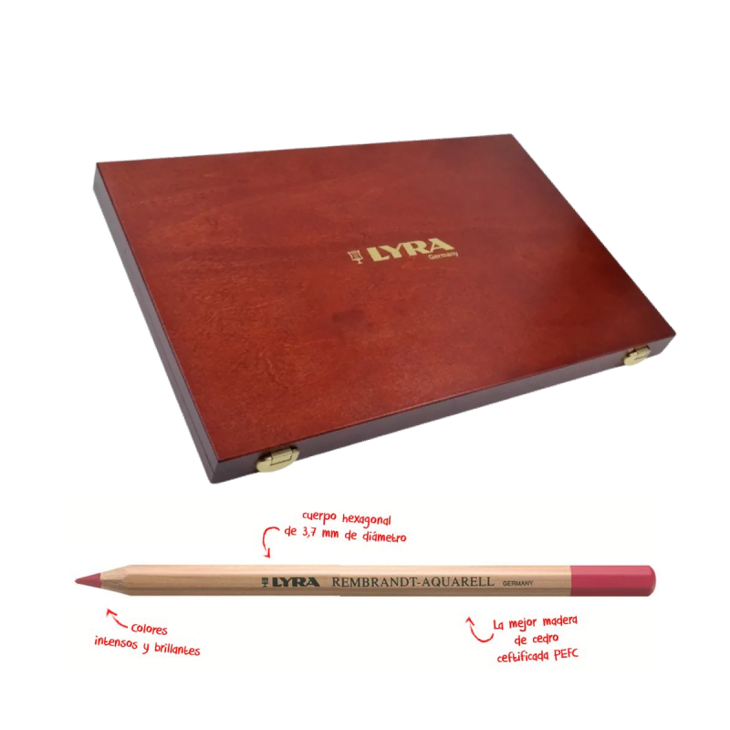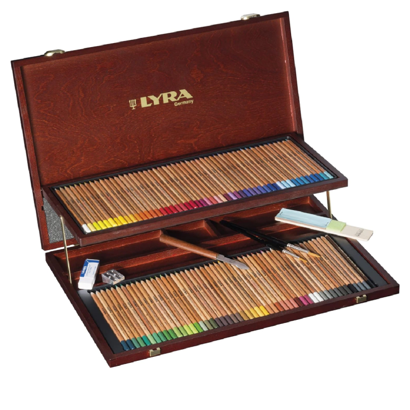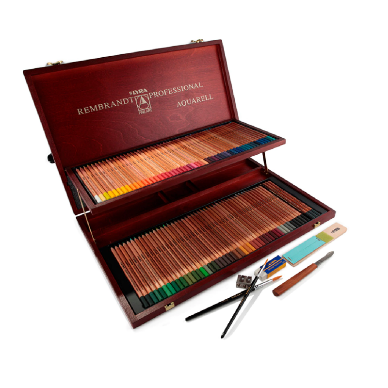 Elegante caja de madera con doble piso conteniendo 96 lápices de colores acuarelables Rembrandt + 3 lápices de grafito acuarelables, 1 lápiz pastel negro, 1 block de lijas finas, 2 pinceles (N° 5 y N° 8), 1 sacapuntas, 1 goma, 1 esteca.