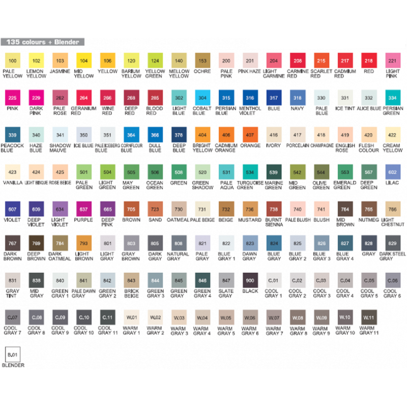 La carta de colores se divide en 9 grupos: básicos, brillantes, naturales, opacos, pálidos, intensos, grises básicos, grises fríos y grises cálidos.