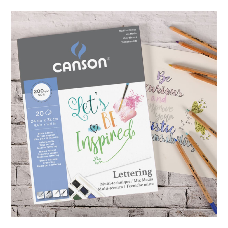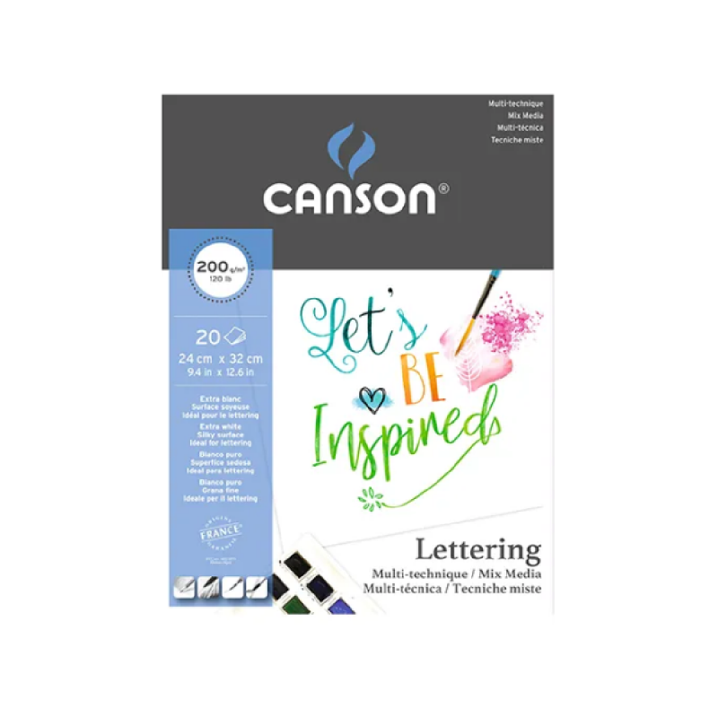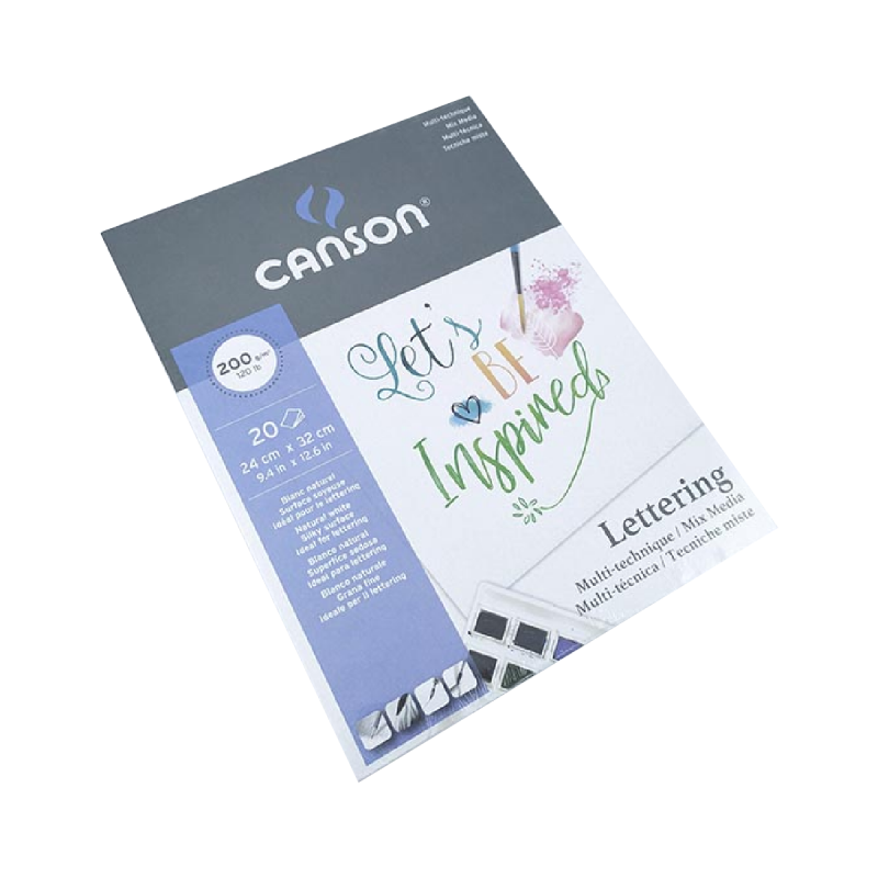 Papel especial para lettering, de superficie extra suave, liso y extra blanco. Con un gramaje de 200g/m2 es ideal para técnicas mixtas: acuarela, marcadores, marcadores punta pincel, tinta china, etc.