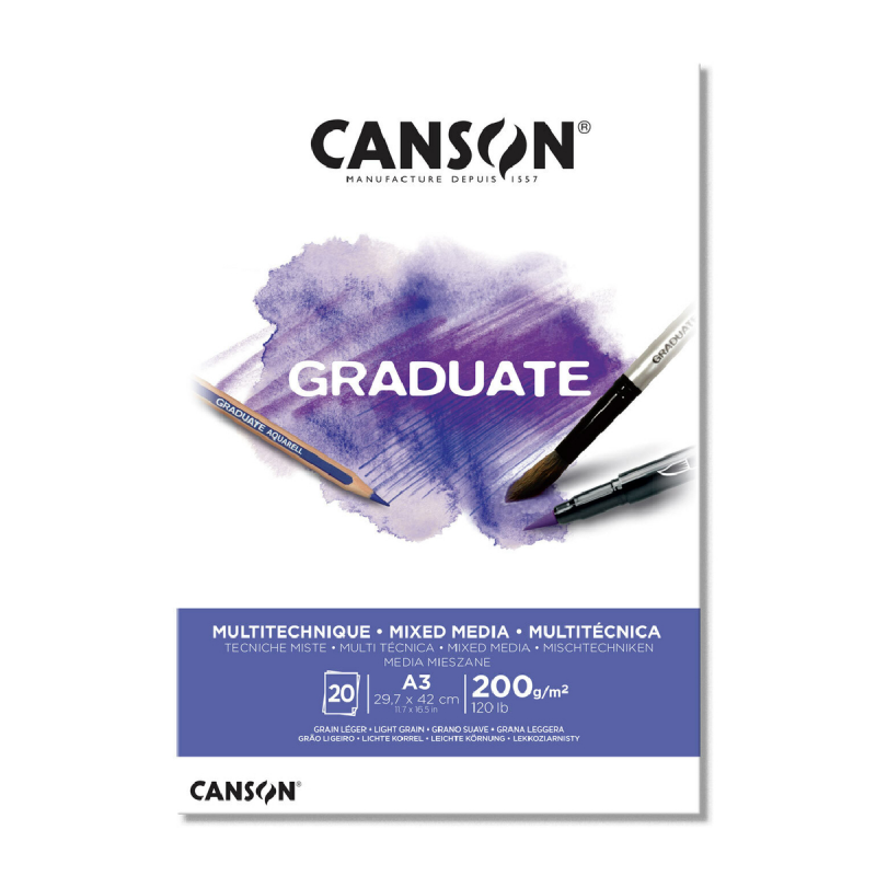 Los blocs Canson Graduate Mixed Media ofrecen un papel blanco, resistente y de grano ligero.