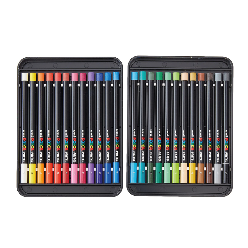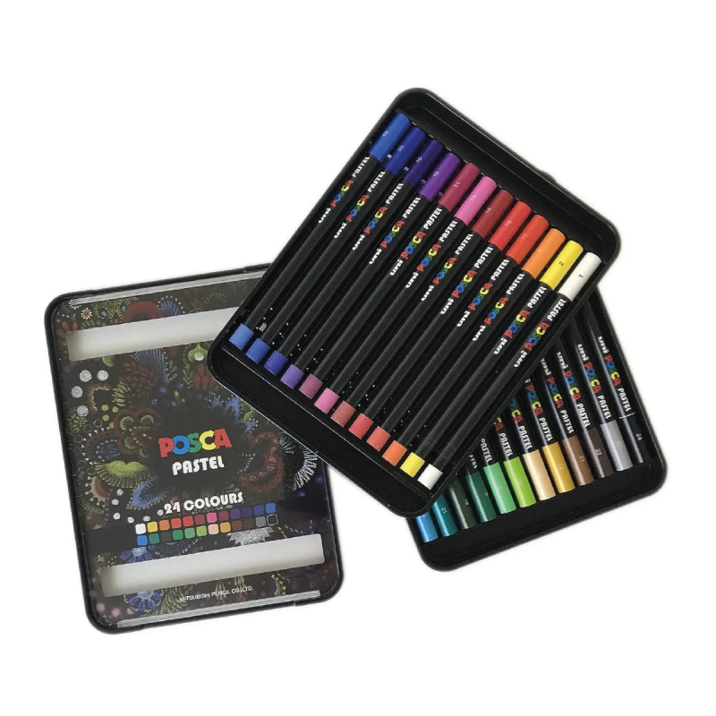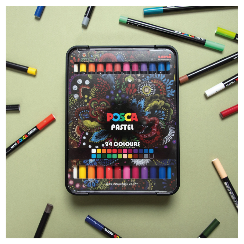 La nueva gama POSCA PASTEL completa la colección de colores POSCA. Su fórmula única contiene más cera que aceite, por lo que los colores son vibrantes con un acabado súper suave. Esto también significa que los POSCA PASTEL apenas dejan residuos en la página. Los colores se pueden mezclar y superponer, se puede puntear, bloquear el color, rayar y perfilar. Además, puedes calentar las barras para crear efectos de textura. Disponibles en 24 colores, los PASTELES POSCA pueden utilizarse sobre madera, vidrio y tela, así como sobre cartón y papel.