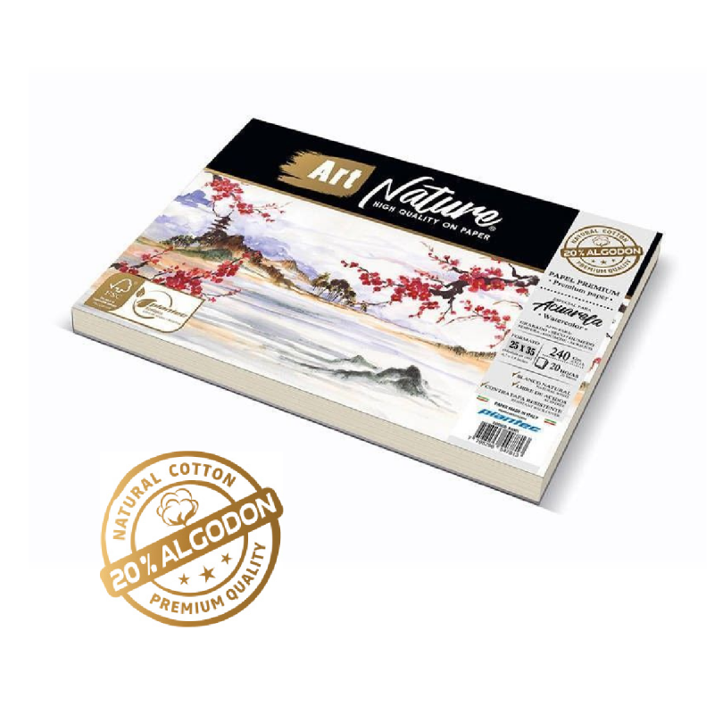 ART NATURE PREMIUM 20% Algodón es un papel artístico ideal para la técnica de acuarela por su gran performance de uso y su composición formulada en base de algodón. También es apto para el grabado en seco y en húmedo, tempera, gouache, acrílico. Se trata de un genuino papel, por su gran resistencia y flexibilidad en el uso. No se utilizan ácidos ni cloro para su fabricación, lo que lo hace resistente al envejecimiento sin amarilleos por el paso del tiempo.