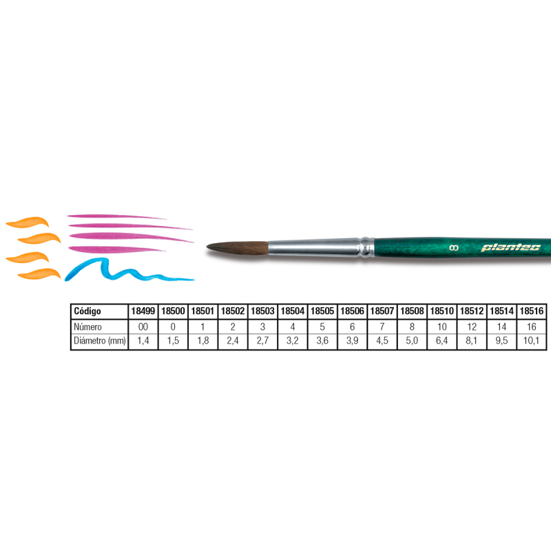 Los pinceles artísticos PLANTEC tienen las siguientes características: Virola de bronce enteriza, niquelada con doble engaste. Mango fabricado con madera estacionada y laqueado. Los pinceles que tienen pelo natural, es seleccionado de primera calidad. Confiere una máxima carga de pintura.