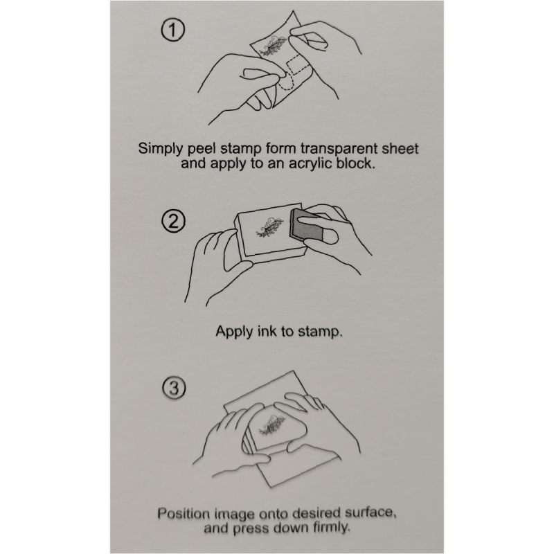 1. Simplemente retire el sello de la hoja transparente y colóquelo en un bloque de montaje acrílico transparente. No se necesitan adhesivos ya que los sellos se adhieren a los bloques.