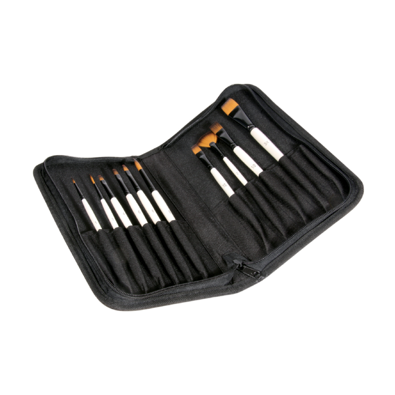 Amplia gama de 10 pinceles de mango corto, seleccionados de modo que las combinaciones satisfagan al artista exigente, en elegante cartuchera con cierre