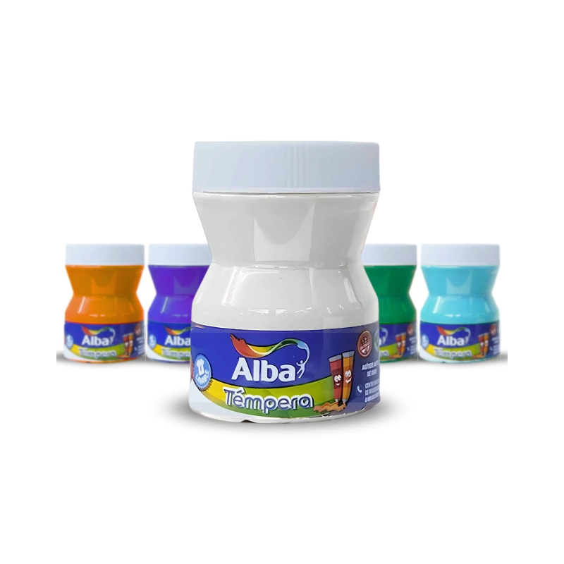 Se fabrican con la misma resina que se emplea en la elaboración de la Témpera extrafina Alba de calidad profesional: la goma arábiga. Este producto de origen vegetal de extendido uso en la industria de la alimentación asegura la no toxicidad del producto. Los pigmentos se seleccionan entre aquellos que permiten colores limpios y vivaces, en una concentración tal que asegura el mayor rendimiento y poder cubritivo. Una vez secas, es posible recuperarlas con agua, manteniendo todas sus propiedades. Tienen una excelente adherencia y un acabado terso, aterciopelado, semimate. Es la témpera recomendada para usar en los grados superiores de la escuela primaria, en la secundaria y en la enseñanza artística que requiera una témpera de calidad cercana a la profesional.