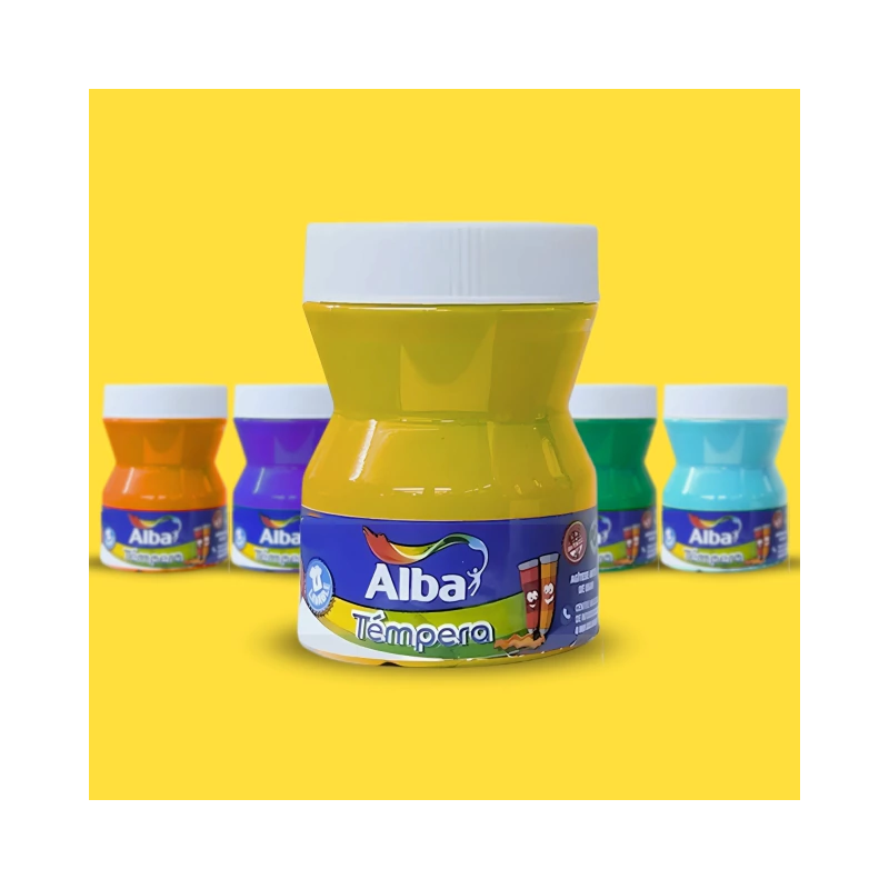 Se fabrican con la misma resina que se emplea en la elaboración de la Témpera extrafina Alba de calidad profesional: la goma arábiga. Este producto de origen vegetal de extendido uso en la industria de la alimentación asegura la no toxicidad del producto. Los pigmentos se seleccionan entre aquellos que permiten colores limpios y vivaces, en una concentración tal que asegura el mayor rendimiento y poder cubritivo. Una vez secas, es posible recuperarlas con agua, manteniendo todas sus propiedades. Tienen una excelente adherencia y un acabado terso, aterciopelado, semimate. Es la témpera recomendada para usar en los grados superiores de la escuela primaria, en la secundaria y en la enseñanza artística que requiera una témpera de calidad cercana a la profesional.