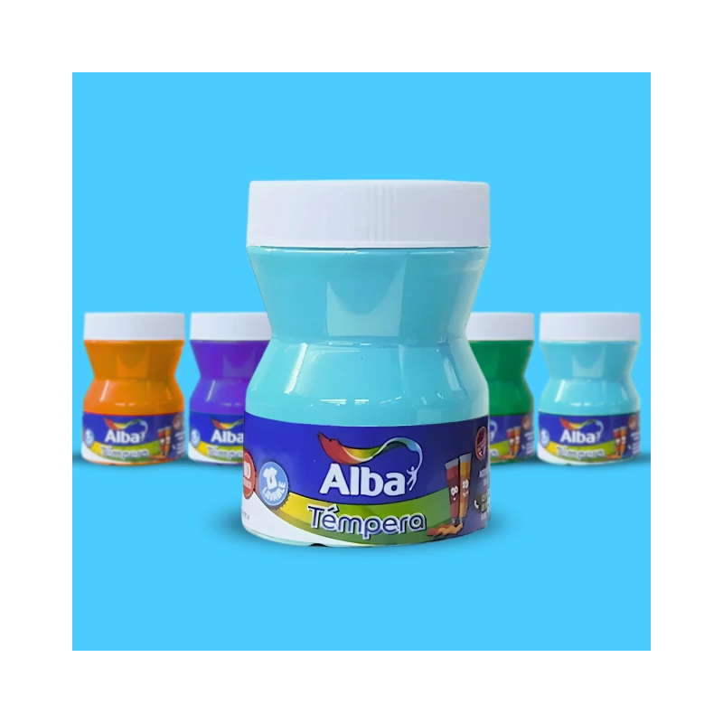 Se fabrican con la misma resina que se emplea en la elaboración de la Témpera extrafina Alba de calidad profesional: la goma arábiga. Este producto de origen vegetal de extendido uso en la industria de la alimentación asegura la no toxicidad del producto. Los pigmentos se seleccionan entre aquellos que permiten colores limpios y vivaces, en una concentración tal que asegura el mayor rendimiento y poder cubritivo. Una vez secas, es posible recuperarlas con agua, manteniendo todas sus propiedades. Tienen una excelente adherencia y un acabado terso, aterciopelado, semimate. Es la témpera recomendada para usar en los grados superiores de la escuela primaria, en la secundaria y en la enseñanza artística que requiera una témpera de calidad cercana a la profesional.