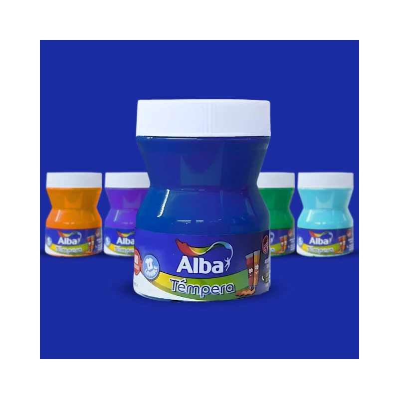 Se fabrican con la misma resina que se emplea en la elaboración de la Témpera extrafina Alba de calidad profesional: la goma arábiga. Este producto de origen vegetal de extendido uso en la industria de la alimentación asegura la no toxicidad del producto. Los pigmentos se seleccionan entre aquellos que permiten colores limpios y vivaces, en una concentración tal que asegura el mayor rendimiento y poder cubritivo. Una vez secas, es posible recuperarlas con agua, manteniendo todas sus propiedades. Tienen una excelente adherencia y un acabado terso, aterciopelado, semimate. Es la témpera recomendada para usar en los grados superiores de la escuela primaria, en la secundaria y en la enseñanza artística que requiera una témpera de calidad cercana a la profesional.